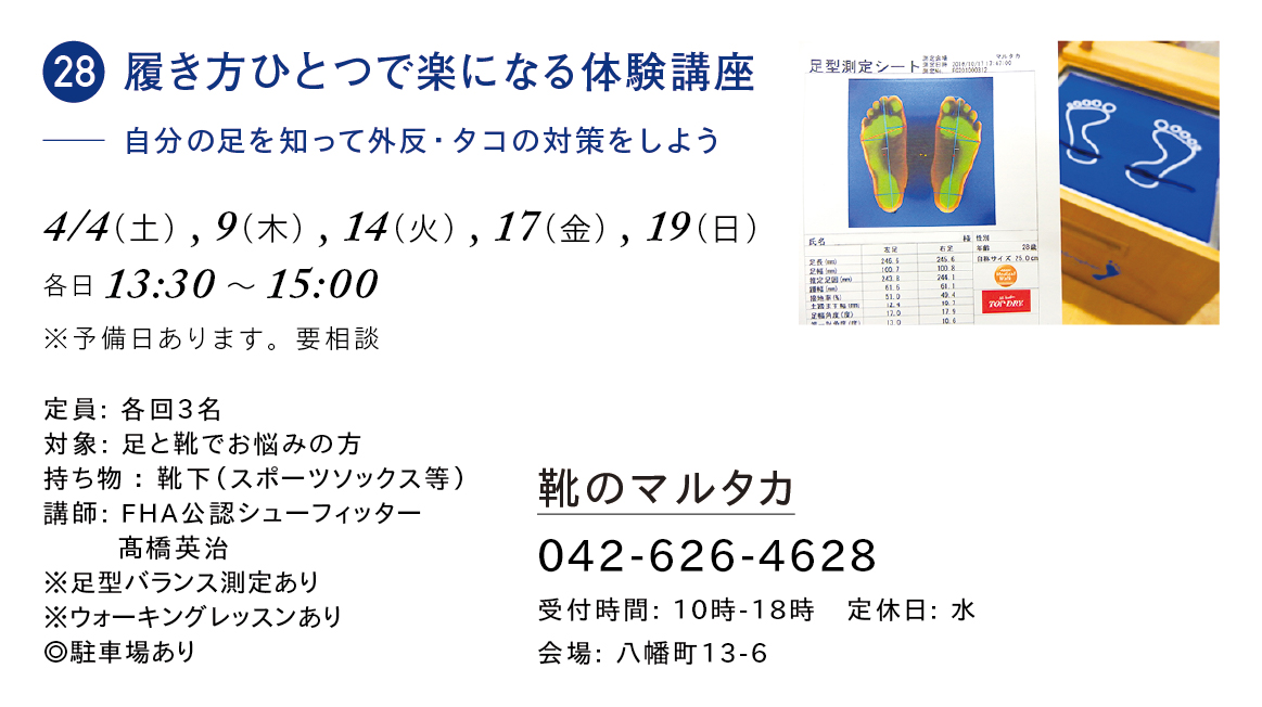 得するまちのゼミナール、略して「まちゼミ」に長く参加しておりまして、前回2025年秋の回では、恐縮ながらチラシの表紙を仰せつかりました。シューフィッティングを気軽に受けてみたい、外反母趾の相談を気軽にしてみたいけれど、最近八王子のマンションに引っ越してきたので、知っているお店がない。そのような状況なら、この「まちゼミ」をご利用いただくのも一つの手だと思います。